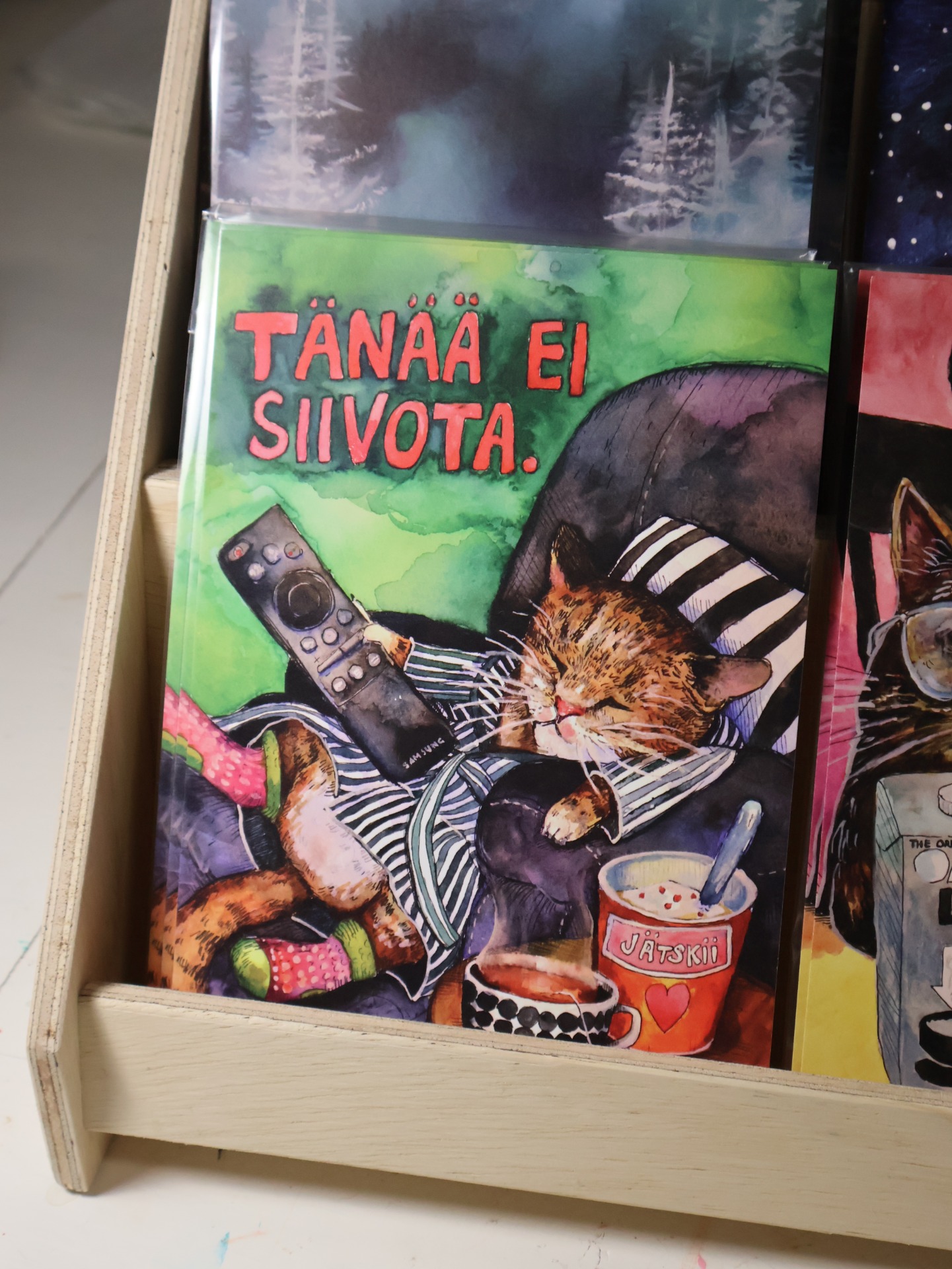 "Kahvikissa" vanerikorvakorut Suomalaista koivuvaneria Koukut kirurginterästä Vanerin pituus 5 cm
