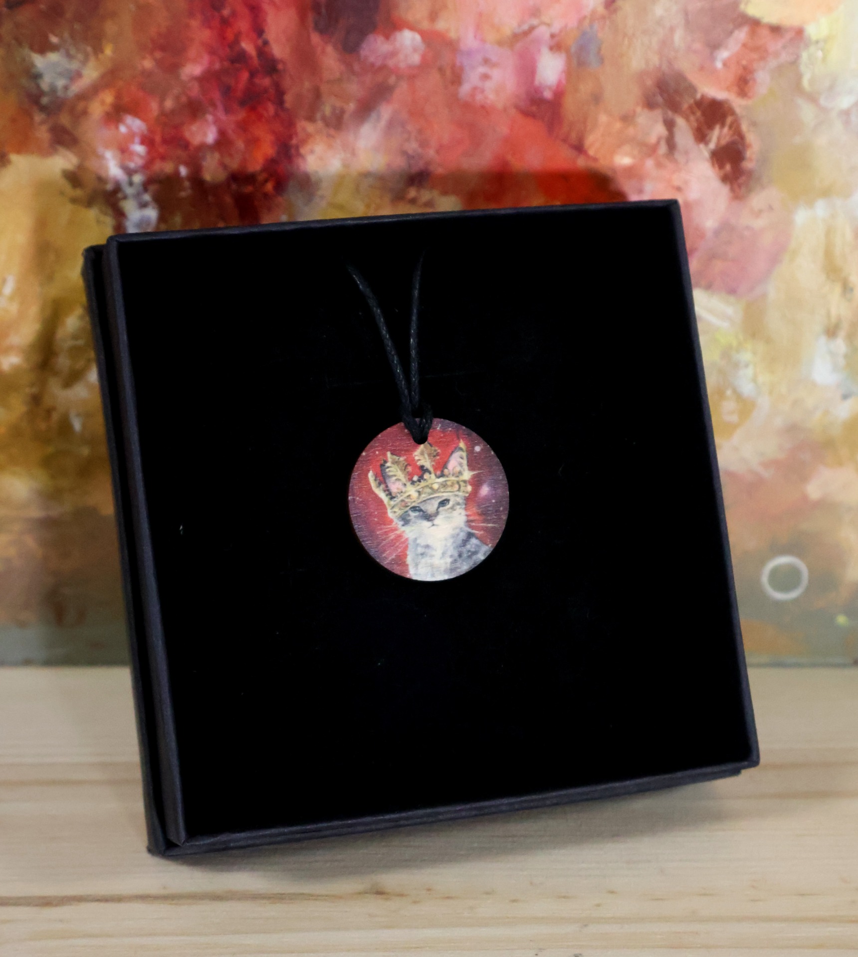 Kuningaskissa - kaulakoru mustalla puuvillanyörillä. Koru suomalaista koivuvaneria.